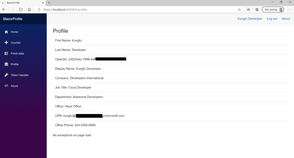 After understanding where the application was failing, I developed a ASP.Net Core Blazor web application to start troubleshooting this issue in a completely separate environment. Knowing the application was trying to call MS Graph on-behalf-of the user, which then failed, it was an easy setup to recreate in a Blazor server-side application. I used the MS Graph Client and pulled across some basic profile properties for a user in the test tenant, with an on-behalf-of flow to display the results in a basic table.