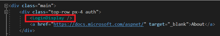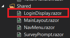 The LoginDisplay component is referenced in the MainLayout.razor component.