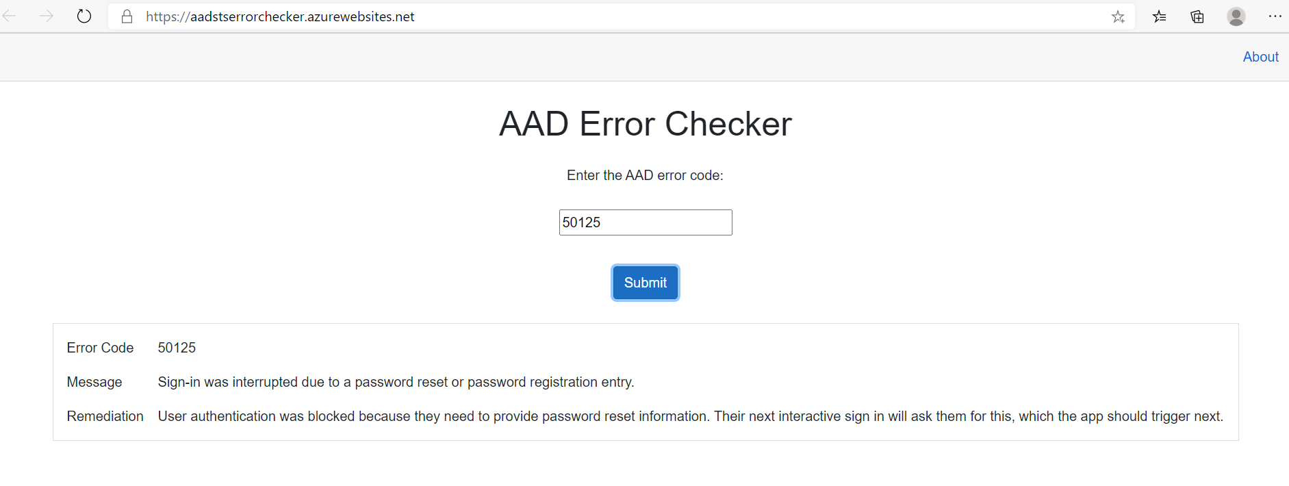 I decided to create my own Blazor application to submit my own AADSTS error codes for troubleshooting. I used the HtmlAgilityPack to pull out the response in the Blazor component to display the details of error codes. This makes it easier to parse the response html and embed the response into a razor page with a reference to ((MarkupString)[HTMLValue])